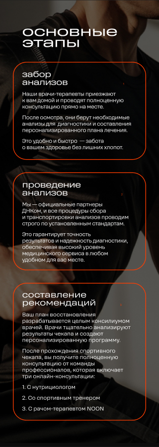 Базовое обследование для тех, кто активно занимается спортом и хочет следить за состоянием своего организма. Этот анализ направлен на выявление возможных отклонений в физических показателях, таких как воспаления, аллергические реакции, анемия, а также состояние печени, почек, щитовидной железы и уровень электролитов. Несмотря на то, что этот чекап не даёт клинического диагноза, он помогает своевременно выявить отклонения и направить на дальнейшее обследование, если это необходимо.
